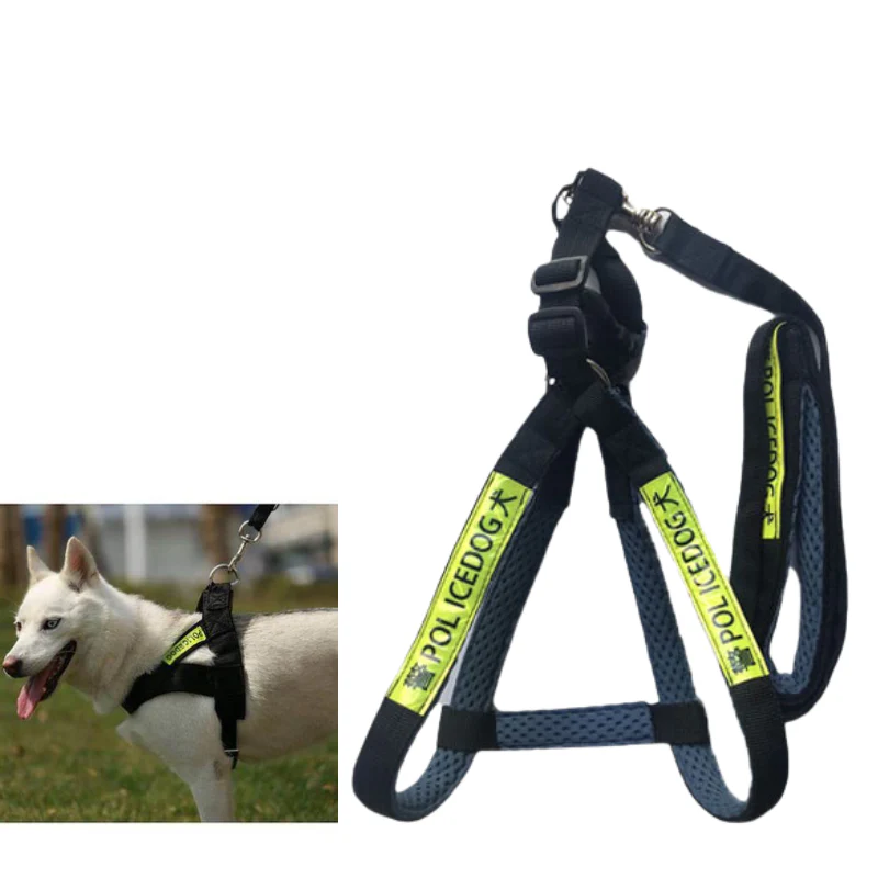 - Ensure your dog’s safety and comfort during every outing with the “POLICEDOG” Reflective Breathable Dog Harness. This premium harness is meticulously engineered for optimal control, visibility, and ergonomic support, making it an essential gear for walks, runs, hikes, and training sessions.
